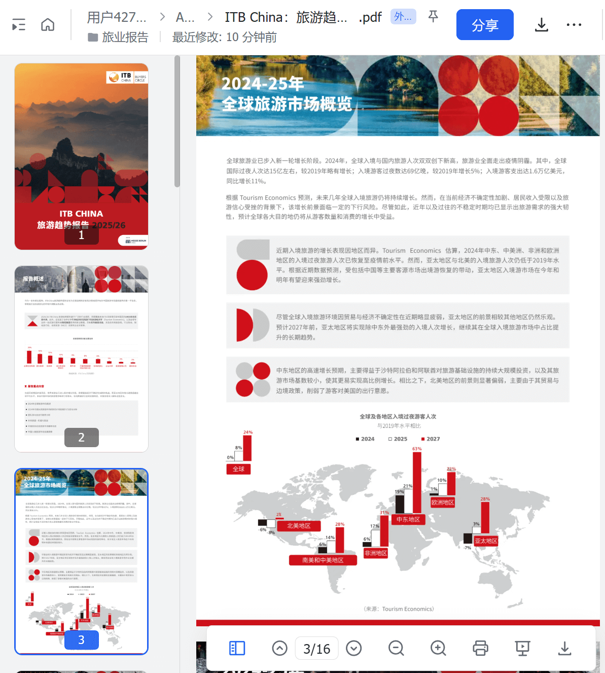 2、2024年中国出境旅游市场持续回暖,较2023年大幅改善。东南亚、日本、韩国及中东地区恢复势头最强,欧洲目的地则有望在今年和明年进一步回暖。中国游客特征和偏好发生变化,自由行趋势持续增强。